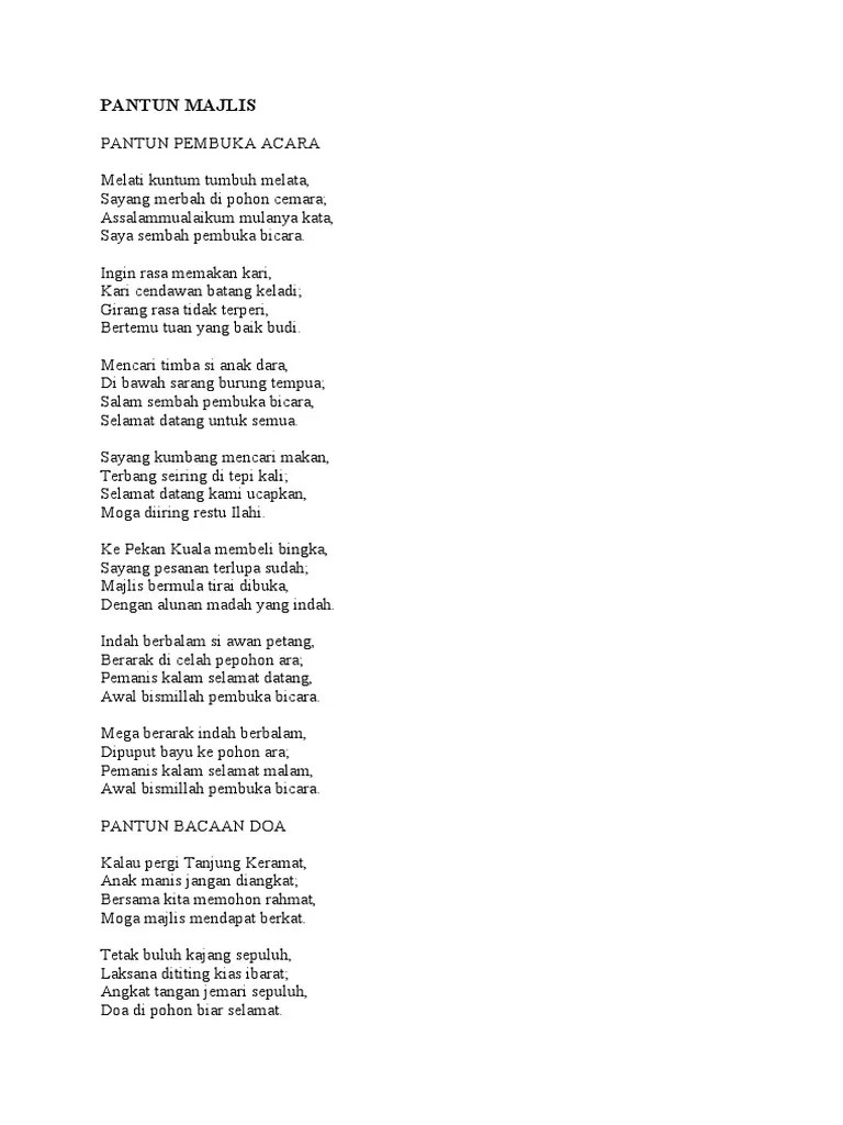 ١٠ ربيع الآخر ١٤٣٩ هـ. Adat berjumpa terpisah jua, moga ketemu di lain waktu. Pantun pembuka majlis kahwin pantun pembuka acara majlis; Kami akan berkongsi koleksi pantun yang sesuai digunakan oleh pengacara majlis. Saat mengisi suatu acara, pastinya akan memulainya dengan salam pembuka, setelah selesai akan diakhiri dengan salam penutup. Berikut merupakan koleksi pantun bagi pembuka acara.